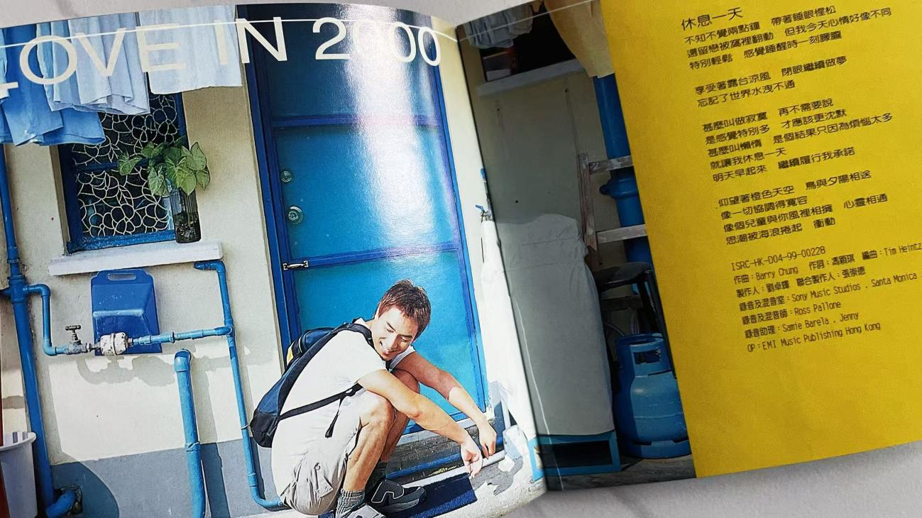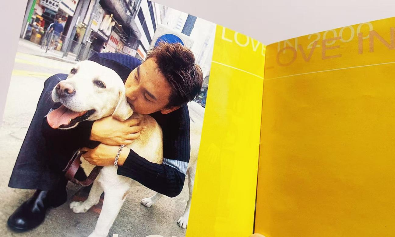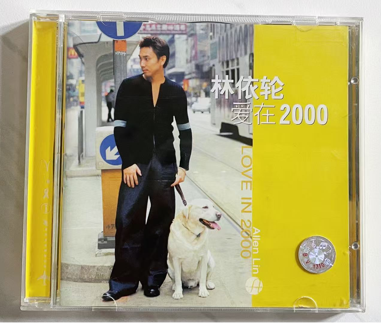 一、这张专辑的“洋气”,先从封面开始。90年代的内地歌手封面,要么是棚拍的浓妆造型,要么是山水间的“抒情摆拍”,但《爱在2000》直接把场景搬到了香港街头:背景里的路牌、报刊亭、疾驰的车辆,衬着林依轮收窄的肩线和垂坠感的裤子,像极了当时TVB剧里的都市男主。最点睛的是那只拉布拉多——后来才知道它是香港某宠物机构的“明星犬”,名叫“阿黄”,特意借来拍摄以强化“松弛的都市感”。明黄色的右侧色块撞开了传统专辑的沉闷,连CD盒上的BMG标志都透着“国际厂牌”的精致,和当年满大街的盗版磁带比,这张专辑光是拿在手里,都像攥着一张“潮流入场券”。