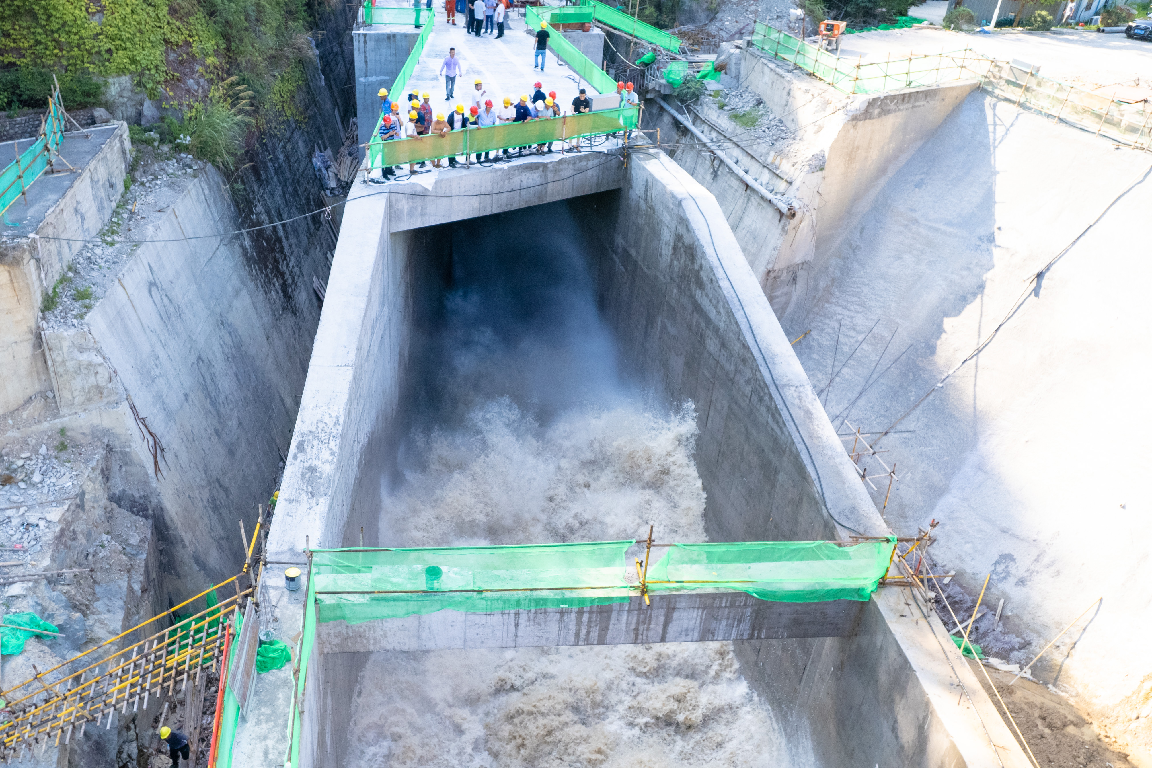 在试通水现场,随着一声令下,操作人员严格按照操作规程操作,弧门缓缓开启并不断加大流量,最终顺利完成通水试验。